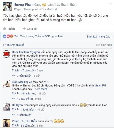 "Hoa hậu gì mà "hai mặt", nói nhiều lời?"Sau khi tập 6 kết thúc, Phạm Hương chia sẻ status ngắn gọn trên trang cá nhân: "Yêu hay ghét tôi, đối với tôi đều là ân huệ... Nếu bạn yêu tôi, tôi sẽ ở trong tim bạn... Nếu bạn ghét tôi, tôi sẽ ở trong tâm trí bạn". Nhanh chóng, dòng trạng thái trở thành chủ đề cho dư luận vào bình phẩm và "vạch trần" con người của Hoa hậu hoàn vũ bởi những mâu thuẫn khó hiểu trong lời nói của cô.