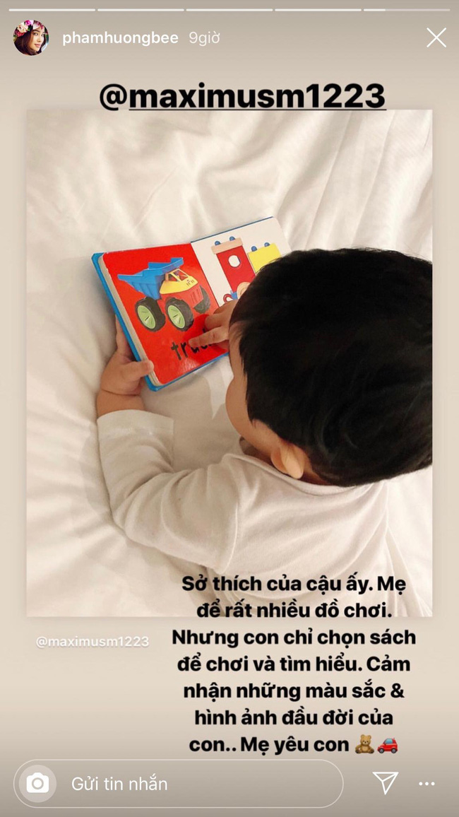 Phạm Hương kể: "Sở thích của cậu ấy. Mẹ để rất nhiều đồ chơi nhưng con chỉ chọn sách để chơi và tìm hiểu. Cảm nhận những màu sắc và hình ảnh đầu đời của con... Mẹ yêu con".