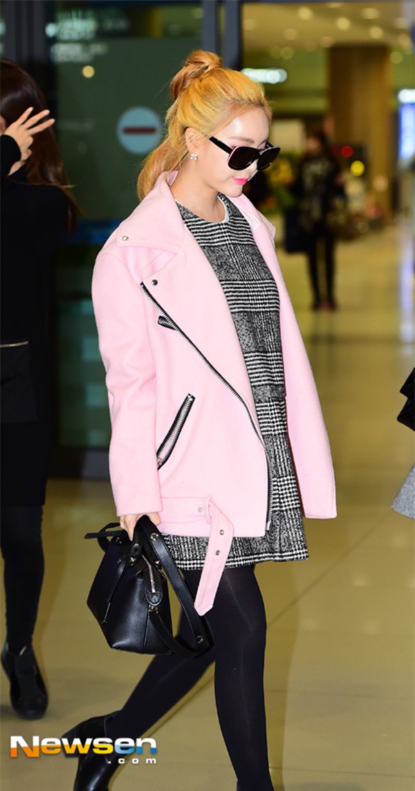 Tại sân bay Incheon, Sunny - thành viên của SNSD nổi bật với chiếc áo khoác lông to sụ màu xanh cobalt. Nữ ca sỹ diện chiếc áo này theo kiểu "trên đông dưới hè", để gần như hoàn toàn đôi chân bên dưới với kiểu giày đế thô kèm tất lửng