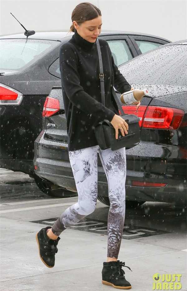 Tiết trời giá lạnh cũng không ngăn nổi Miranda Kerr khoe dáng vóc quyến rũ trong chiếc áo len cổ lọ và đôi tregging in họa tiết bắt mắt.