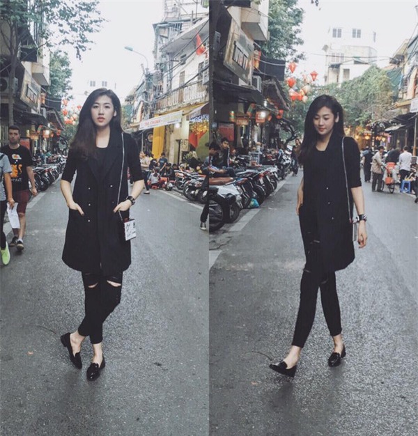 Street style với Á hậu Tú Anh thường là "cuộc chơi" với tông màu đen. Tuần này cũng không hề ngoại lệ khi người đẹp diện sắc màu kinh điển này từ đầu đến chân với áo khoác, quần skinny và giày lười.