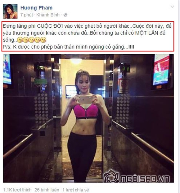 'Đừng lãng phí cuộc đời vào việc ghét bỏ người khác. Cuộc đời này, để yêu thương người khác còn chưa đủ, bởi chúng ta chỉ có một lần để sống...' - Phạm Hương viết.