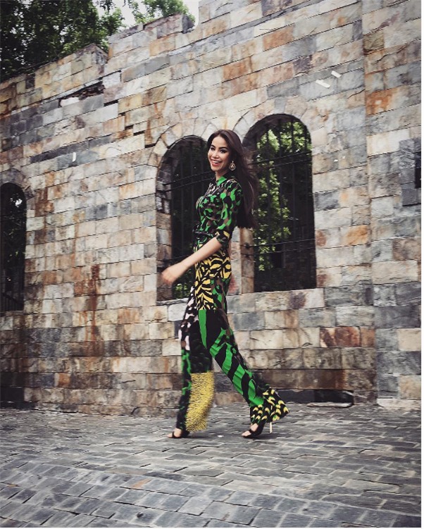Phạm Hương tươi tắn và quyến rũ sải bước trong bộ trang phục họa tiết nổi bật của Versace. Trong đó chiếc áo của Phạm Hương có giá £ 790 (khoảng 25,5 triệu đồng) và thiết kế quần ống rộng có giá £ 820 (khoảng 26,5 triệu đồng).
