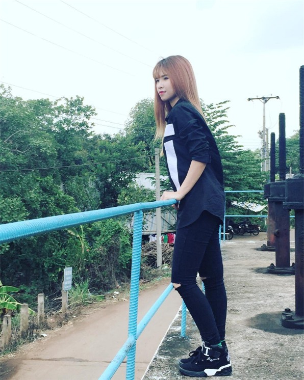 Khởi My diện trang phục cực kỳ đơn giản nhưng khỏe khoắn và năng động với sơ mi, skinny rách gấu và sneaker.