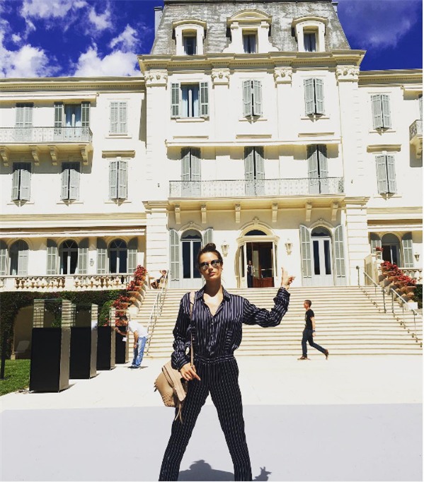 Siêu mẫu Alessandra Ambrosio trẻ trung trên đường phố Cannes trong bộ suit kẻ sọc.