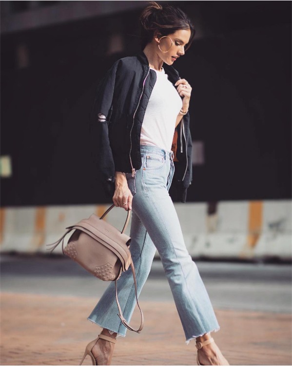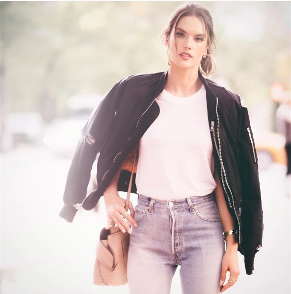 Thiên thần Victoria's Secret sải bước với bộ trang phục đơn giản nhưng rất chuẩn xu hướng với sự xuất hiện của quần jeans lửng loe xé gấu.
