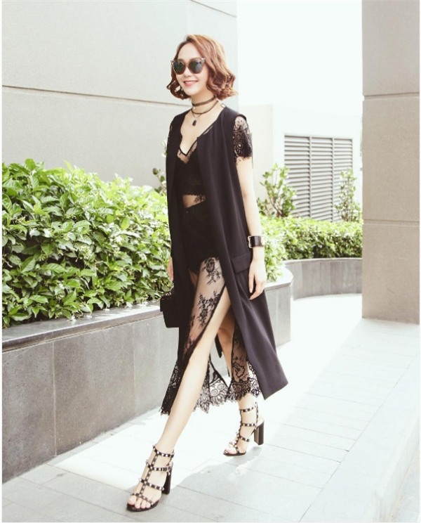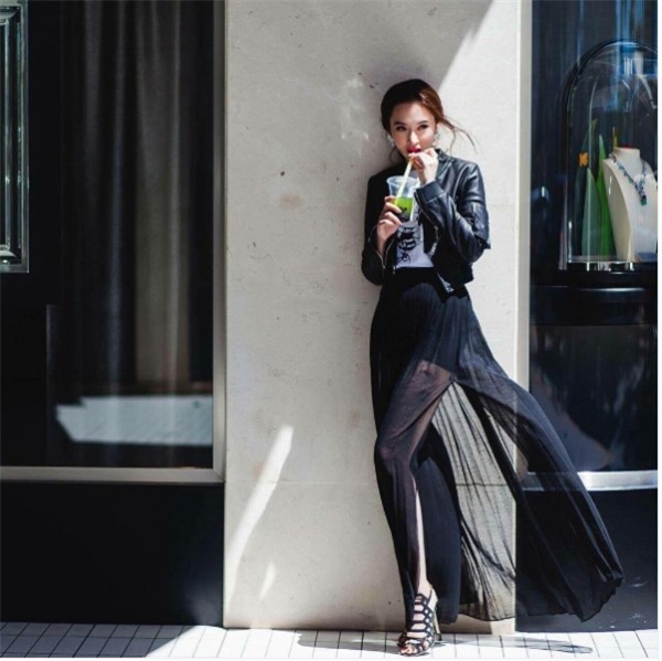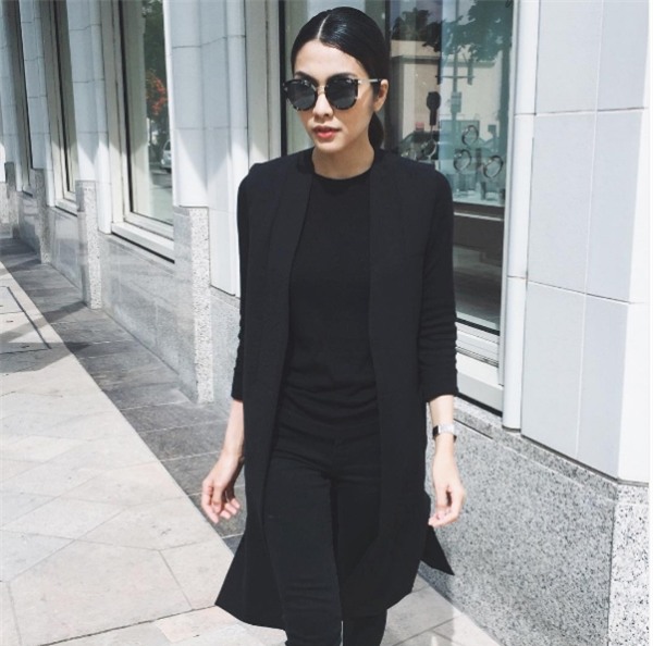 Bà mẹ một con với set đồ đen kín đáo nhưng vẫn cực cá tính với áo khoác không tay dáng dài, áo thun và skinny.
