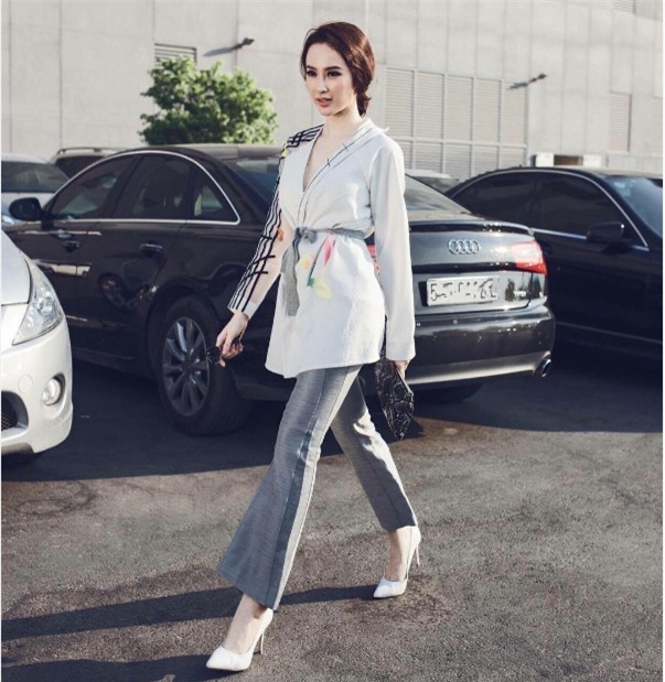 Phương Trinh với bộ cánh cá tính và thanh lịch với áo wrap và quần ống loe lửng.