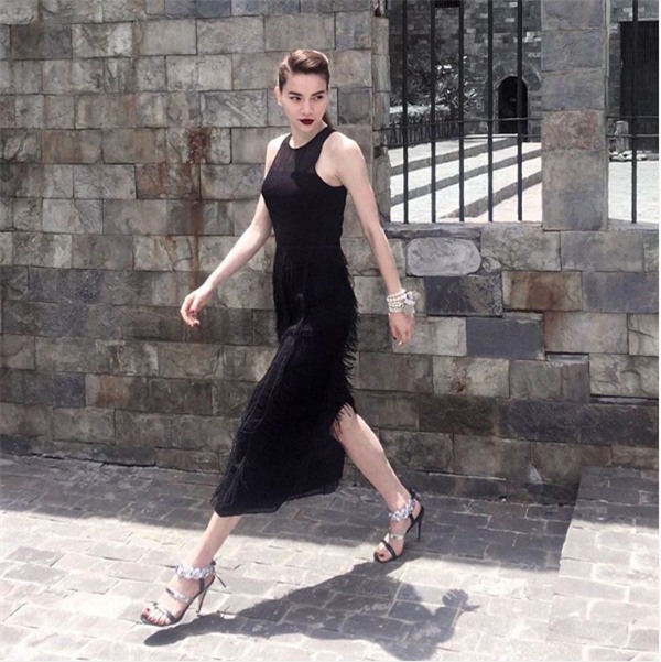 Hà Hồ xuống phố trong chiếc váy đen kín đáo thanh lịch kết hợp cùng sandals cao gót đính đá nổi bật.