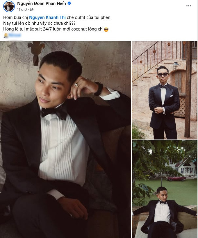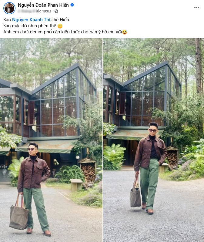 Mới đây, Phan Hiển chia sẻ loạt hình khoe outfit mới. Kiện tướng dance sport đằng kèm dòng trạng thái: "Bạn Khánh Thi chê Hiển sao mặc đồ nhìn phèn thế. Anh em chơi denim phổ cập kiến thức cho bạn ý hộ em với".