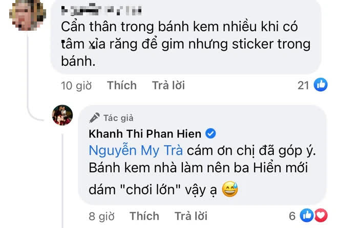 Ngay lập tức, Khánh Thi cũng đã lên tiếng giải thích về vụ việc này ngay dưới phần bình luận: "Cảm ơn các anh chị đã góp ý. Bánh kem nhà làm nên ba Hiển mới dám chơi lớn vậy ạ".