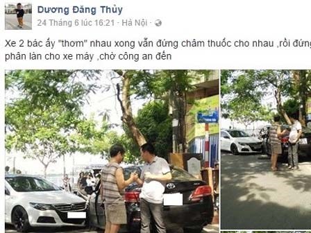 Thay vì cãi vã hay ẩu đả, hai người đàn ông này lại vui vẻ bắt tay nhau, phân làn đường tránh ùn tắc giao thông và chờ công an đến giải quyết.