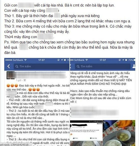 Việc ăn uống, ngủ nghỉ hay kiêng cữ thế nào sau khi sinh hiện vẫn đang khiến các chị em tranh cãi nảy lửa. Mỗi người một ý kiến, ai cũng cho rằng mình có lý riêng của mình. Và kết cục là việc đem chuyện riêng của mình lên tâm sự nhiều khi chẳng thể giải quyết được gì mà lại còn biến chị em trở thành đối tượng bị đả kích như cô con dâu trong câu chuyện trên. Vì thế, khi quyết định đưa chuyện gì lên mạng thì có lẽ chị em nên cân nhắc thật kỹ, tìm cách giải quyết trước và nếu có đưa lên mạng xã hội than vãn thì cũng phải nói rõ đâu đuôi câu chuyện để không bị hiểu nhầm gây ra những tai hại khó lường.