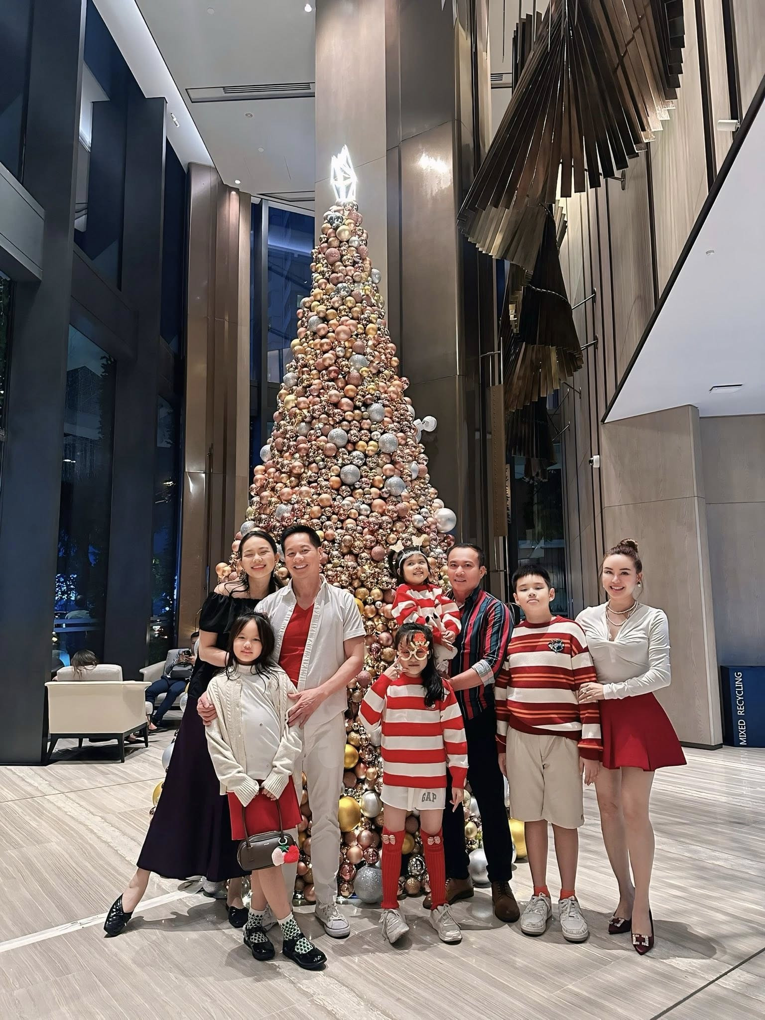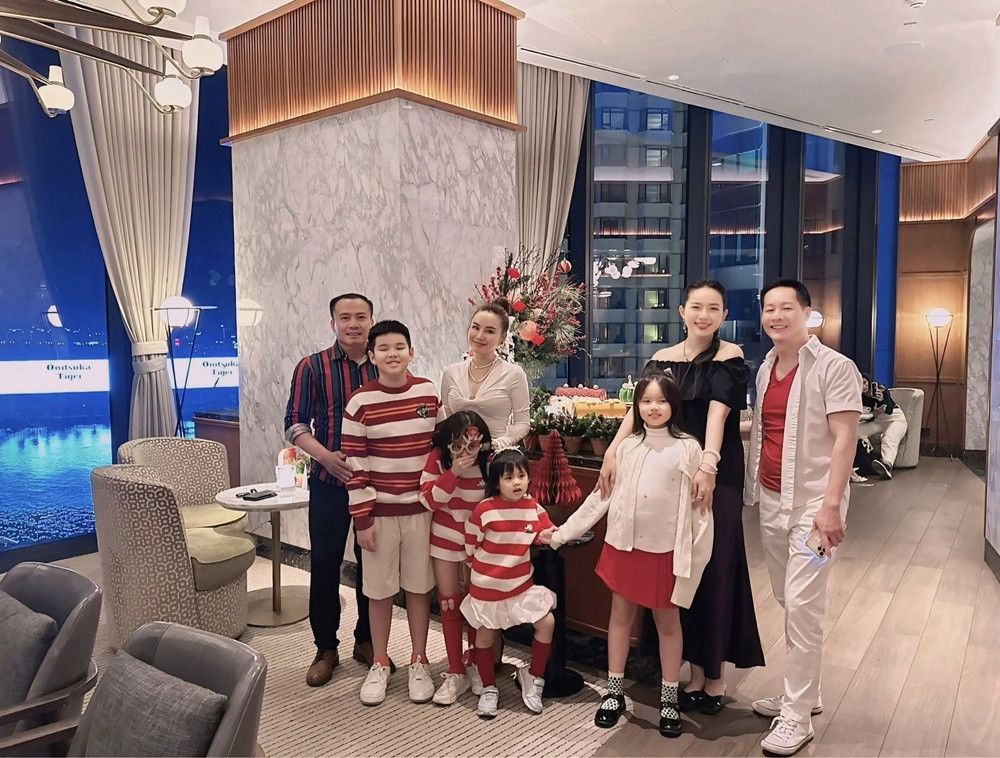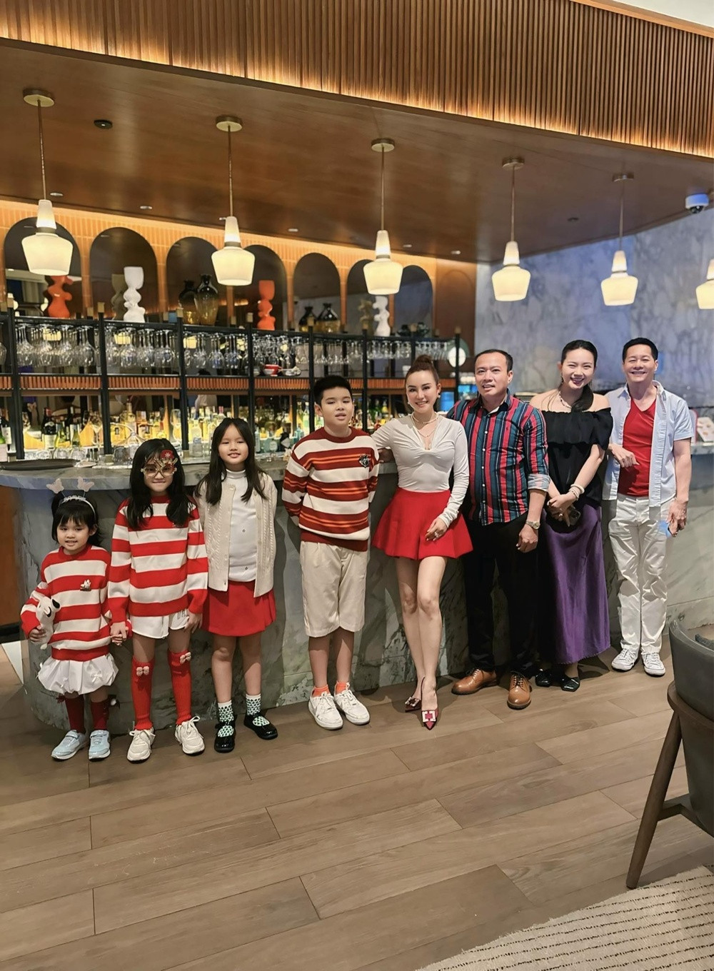 Trong hình, hai gia đình lên đồ dresscode đỏ - trắng hưởng ứng không khí mùa giáng sinh. Trong khi đó, Phan Như Thảo lại chọn hack dáng bằng trang phục tối màu. Người đẹp cũng thường đứng nép phía sau các con để giấu dáng.