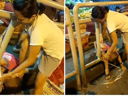 | Người mẹ dùng chân ấn đầu con rồi buộc vào rào chắn. |