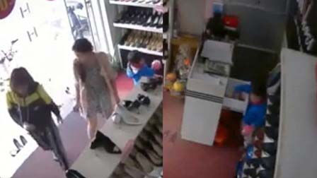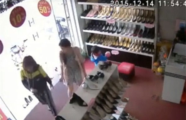 Theo đó vào thời điểm 11h trưa ngày 14/12/2015, một bà mẹ trẻ mặc áo khoác, một tay bó bột dắt theo con traikhoảng 3 tuổi vào cửa hàng bán giày. Lúc này trong cửa tiệm chỉ có một nữ nhân viên.
