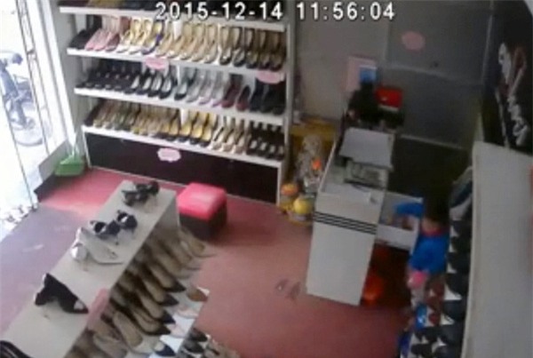 Đoạn video ghi lại cảnh người phụ nữ chủ động dàn cảnh để bé trai nhỏ tiến lại quầy lễ tân lục lọi, trộm tiền. Sự việc được ghi lại ở một cửa hàng bán giày dép tại Hà Nộingày 14/12/2015.
