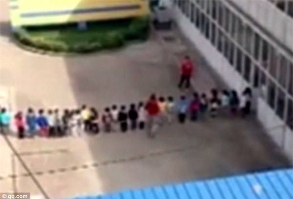 Theo đó, trong clip có khoảng 30 em đứng xếp hàng tại sân trường. Một giáo viên mặc áo đỏ, được xác định là cô Yan Hao đi lại quanh các em học sinh nhiều lần trước khi đá từng em một từ phía sau. Một giáo viên khác cũng mặc áo đỏ thì đứng nhìn.