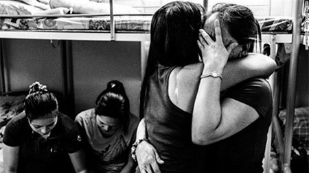 Hai người giúp việc ôm nhau khóc vì bị ngược đãi tại nhà chủ. |