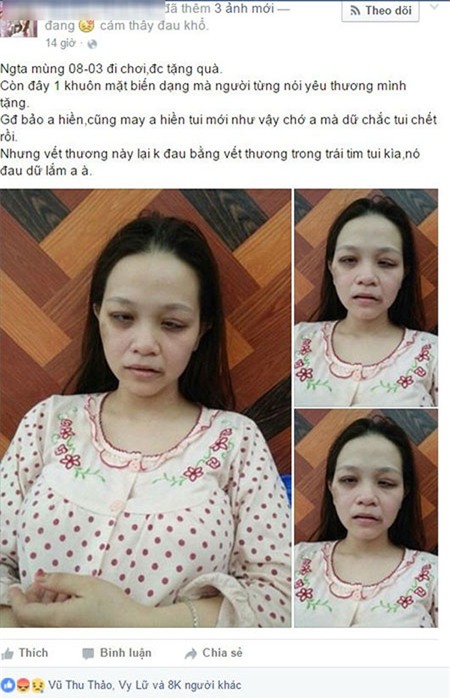 Trên facebook cá nhân, người phụ nữ này tâm sự chua xót: “Người ta mùng 8/3 đi chơi, được tặng quà, còn đây một khuôn mặt biến dạng mà người từng nói yêu thương mình tặng”.