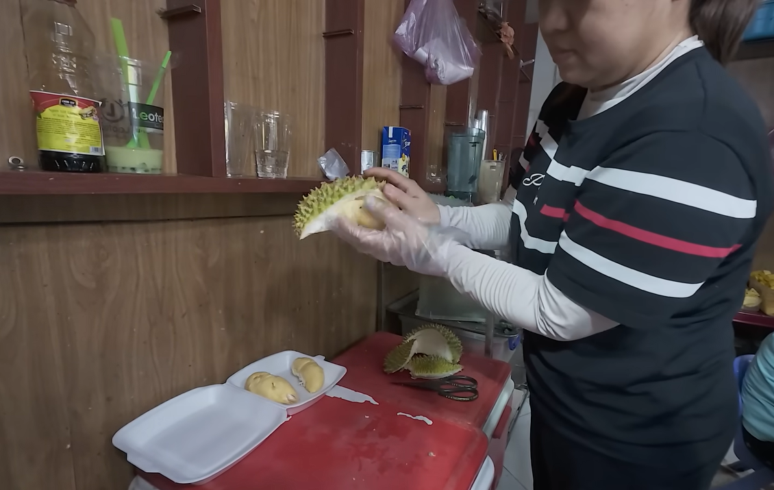 Khi quan sát chủ quán bổ sầu riêng và tách múi khéo léo, nữ du khách không giấu nổi biểu cảm thích thú, nói muốn thưởng thức luôn tại chỗ.