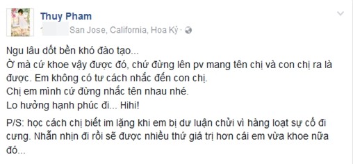 Ờ mà cứ khoe vậy được đó, chứ đừng lên phỏng vấn mang tên chị và con chị ra là được. Em không có tư cách nhắc đến con chị. Chị em mình cứ đừng nhắc tên nhau nhé. Lo hưởng hạnh phúc đi... Hihi!