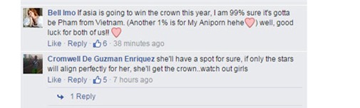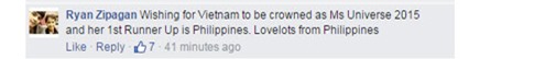 Cầu chúc cho Việt Nam sẽ trở thành Hoa hậu Hoàn Vũ 2015 và Philippines trở thành Á hậu 1. Tình yêu gửi đến từ Philippines.