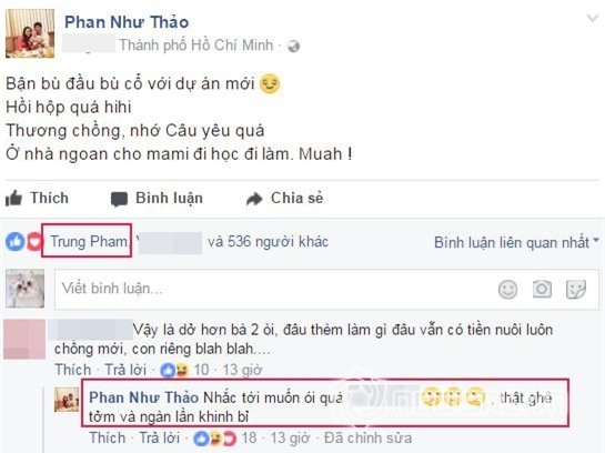 Giữa tâm bão giữa chồng và vợ cũ, Phan Như Thảo tất bận lao vào dự án mới. Ở dưới phần bình luận, một người ngầm nhắc đến Ngọc Thúy: "Vậy là dở hơn bà hai rồi, đâu thèm làm gì đâu vẫn có tiền nuôi luôn chồng mới, con riêng" (Ngọc Thúy đã tái hôn và có con riêng với chồng luật sư). Ngay bên dưới, Phan Như Thảo viết: "Nhắc tới muốn ói quá. Thật ghê tởm và ngàn lần khinh bỉ". Tuy không chỉ đích danh nhưng nhiều người cho rằng người mà Phan Như Thảo bóng gió nhắc đến chính là Ngọc Thúy.