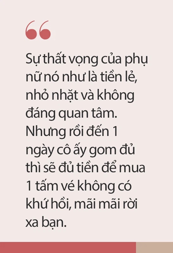Nó không vô lí đâu các anh ạ, hành động đó mới thực sự là giọt nước tràn ly. Khi các anh vô tâm thậm chí là vô tình làm tổn thương vợ, các anh nhanh chóng quên mau còn niềm đau lại ăn sâu vào tâm khảm phụ nữ. Để đến 1 ngưỡng nhất định, cô ấy sẽ tự tay "kết liễu" thứ mà mình từng dày công vun đắp.