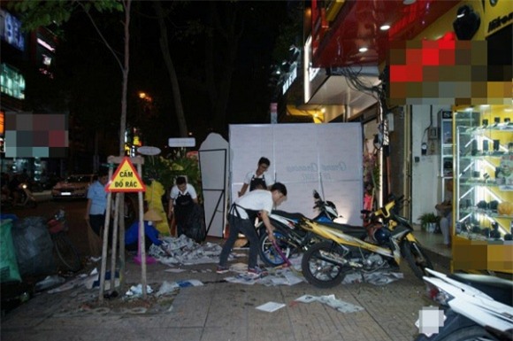 Những bịch sơn, xô mắm tôm bị đối tượng lạ mặt ném tung tóe trước cửa hàng mới khai trương của Phạm Hương. Hiện vụ việc đang được điều tra làm rõ.