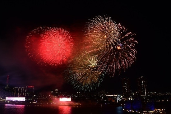 Pháo hoa bừng sáng bầu trời, tạo nên khung cảnh lung linh, đẹp mắt bên bờ biển TP.HCM.