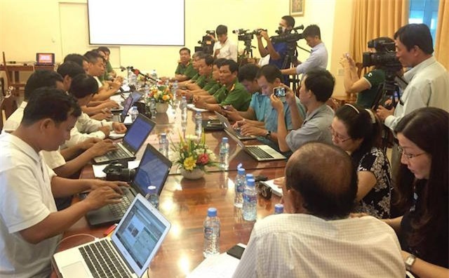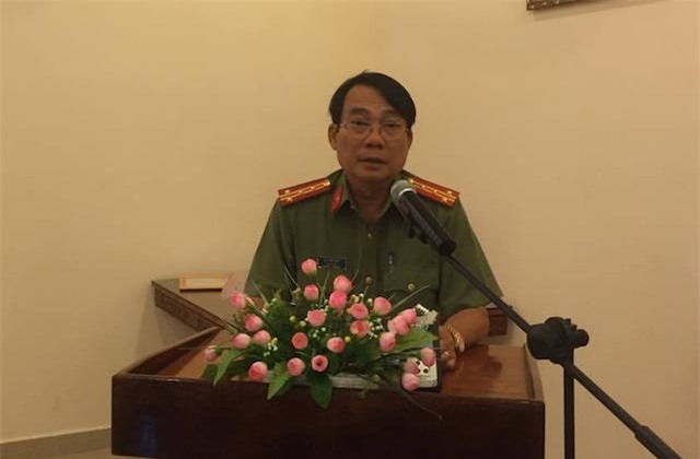 Đại tá Lê Văn Việt, Giám đốc Công an tỉnh Trà Vinh phát biểu tại cuộc họp báo |