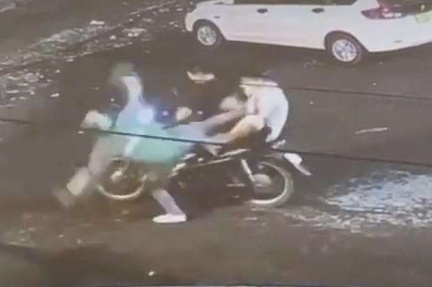 Anh G (áo xanh) chống trả lại 2 tên cướp nhưng không thành. Ảnh cắt từ clip.