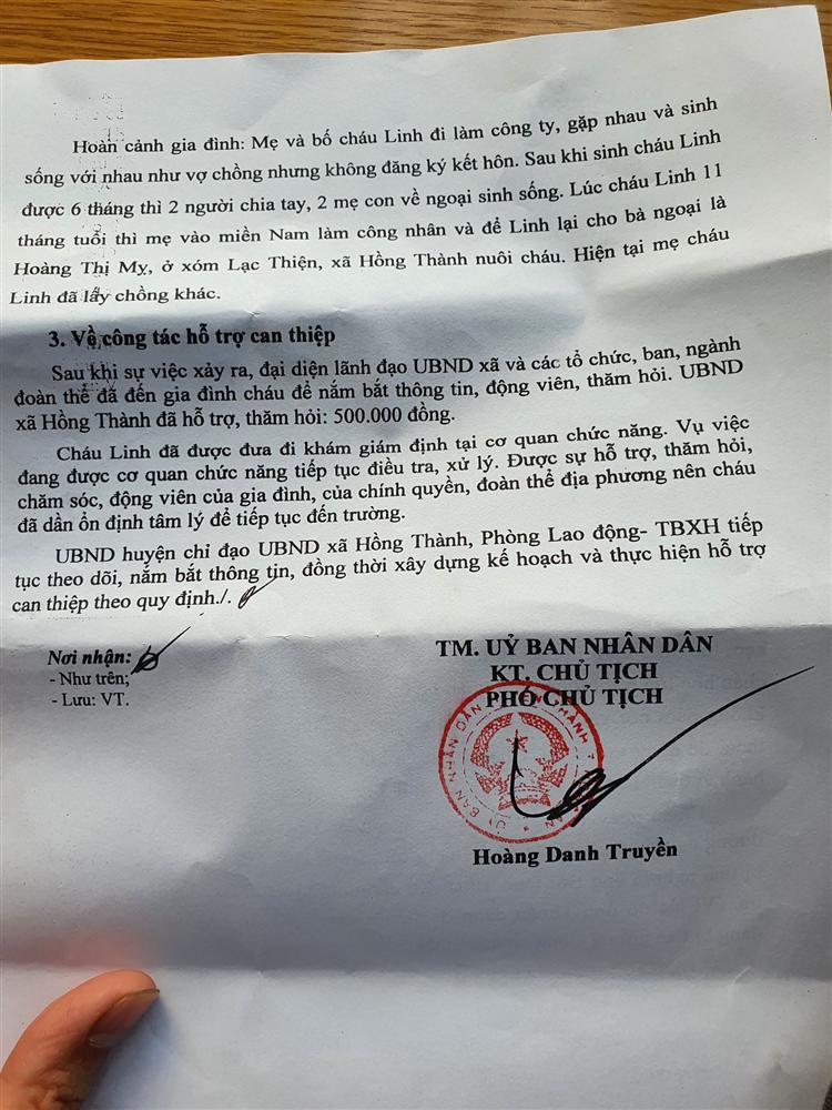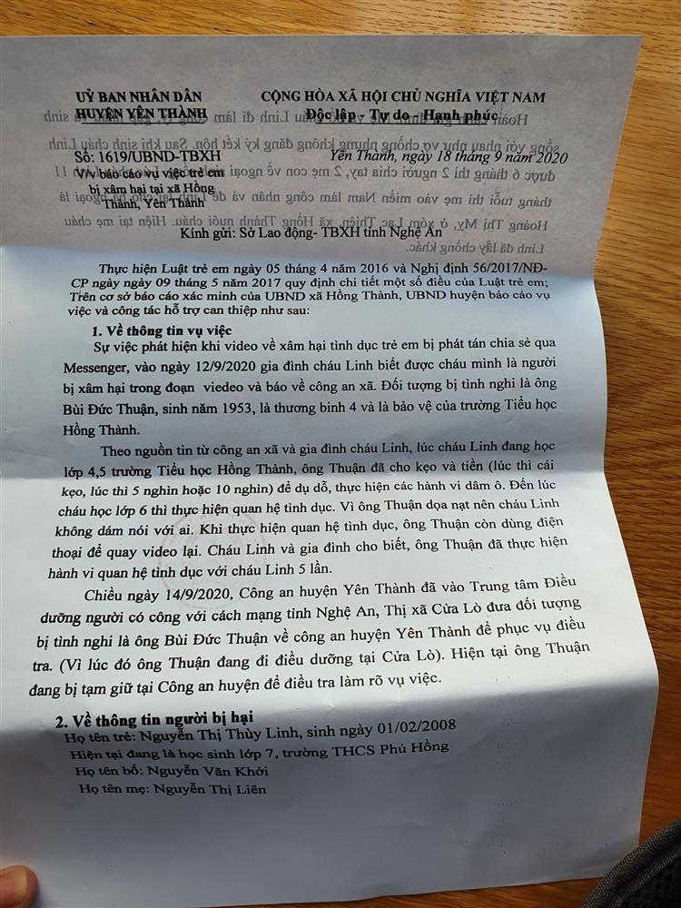 Báo cáo của huyện Yên Thành gửi Sở LĐTB&XH về việc nữ sinh lớp 7 bị xâm hại tình dục.