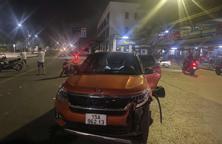 Thu giữ tại hiện trường: 1 xe ô tô nhãn hiệu Kia, số loại Seltos, BKS 15A-962.13, màu da cam bị vỡ phần cản trước và khu vực cụm đèn bên ghế lái. Trên kính cánh cửa ghế phụ có 1 vết thủng hình tròn, đường kính khoảng 1 cm. Kiểm tra bên trong xe thấy 1 mảnh kim loại dạng chì móp méo, nghi là đạn súng thể thao.
