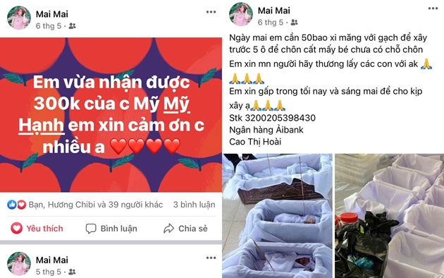 Tiếp theo đó, người mẹ 3 con vào những trang fanpage, facebook của những người đang làm thiện nguyện cho trẻ sơ sinh thương vong, lựa chọn hình ảnh thương tâm về những thai nhi xấu số không được làm người rồi sao chép về facebook Mai Mai. Đồng thời, Hoài kê gọi quyên góp tiền để mua đất, vật tư xây dựng phục vụ mai táng cho những sinh linh về nơi an nghỉ.