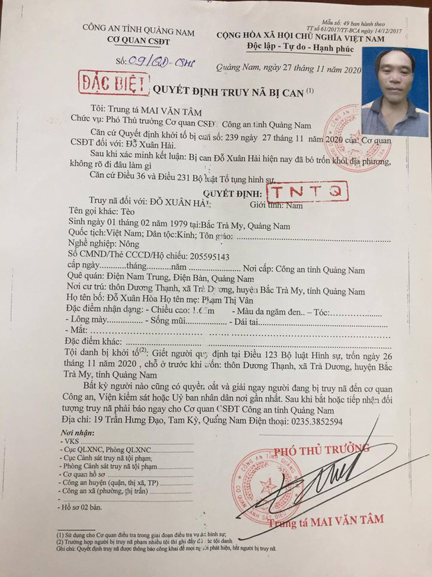 Hiện, Công an tỉnh Quảng Nam đã ra quyết định truy nã đặc biệt về tội "Giết người" với nghi phạm Đỗ Xuân Hải.