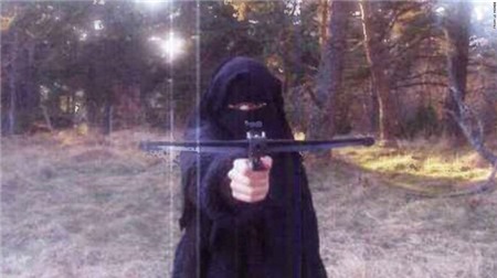 Hayat Boumeddiene tập bắn nỏ trong rừng. Ảnh: Le Monde