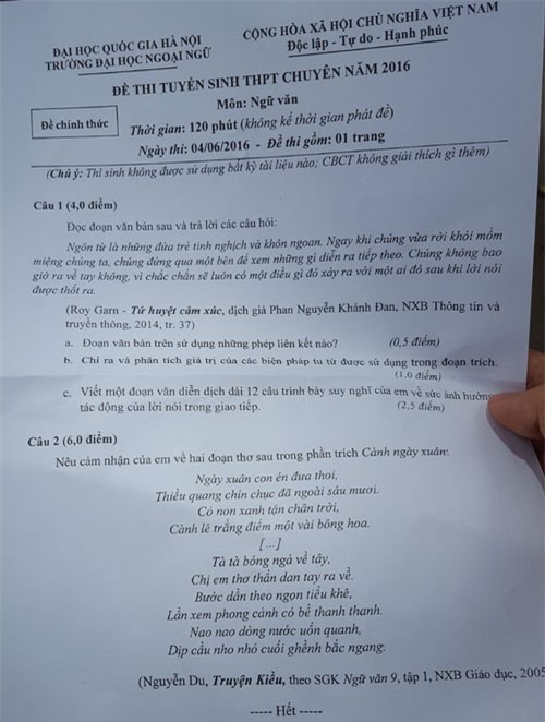 Sáng 4/6, học sinh làm bài thi môn Văn vào lớp 10, trường THPT chuyên Ngoại ngữ (ĐH Ngoại ngữ, ĐHQG Hà Nội). Đề thi được nhiều thí sinh cho là bất ngờ nhưng hay.