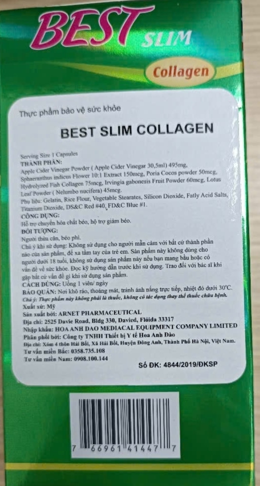 Thực phẩm bảo vệ sức khỏe Best Slim Collagen (số lô 29L367, hạn dùng tháng 1/2027). Thương nhân nhập khẩu, phân phối và chịu trách nhiệm về chất lượng hàng hóa là Công ty TNHH Thiết bị Y tế Hoa Anh Đào, địa chỉ: Xóm 4 thôn Hải Bối, xã Hải Bối, huyện Đông Anh, Hà Nội.