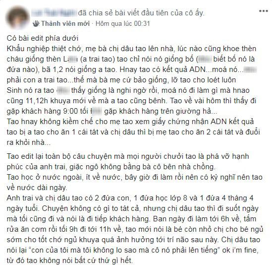 “Mẹ bà chị dâu mình lên nhà, lúc nào cũng khoe thằng cháu giống L. (tên anh trai mình). Mình chỉ nói nó giống bố, bà í 1, 2 câu đều bảo giống anh mình. Hôm nay mình có kết quả AND, nó không phải con anh trai mình thật.