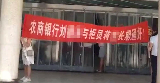 Trong đoạn video được chia sẻ, hai người đã giăng biểu ngữ đỏ chót có dòng chữ: “Liu XX của ngân hàng XX ngoại tình với nhân viên giao dịch XX trong một khoảng thời gian dài”.