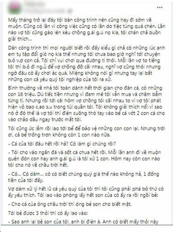 Dân công trình thì mọi người biết rồi đấy kiểu gì chả có những lúc anh em tụ tập "đổi gió" nọ kia thế nhưng tôi chưa bao giờ nghĩ tới chuyện bỏ vợ con cả. Tôi chỉ "vui chơi qua đường" tí thôi. Mỗi lần vợ to tiếng tôi thì bỏ đi ngủ để vợ chồng đỡ cãi nhau. Nghĩ vợ cũng thôi nhưng ngờ đâu cô ấy chơi ác quá. Miệng không nói gì nhưng tay lại bắt những con cá yêu quý tội nghiệp của tôi ra xử.