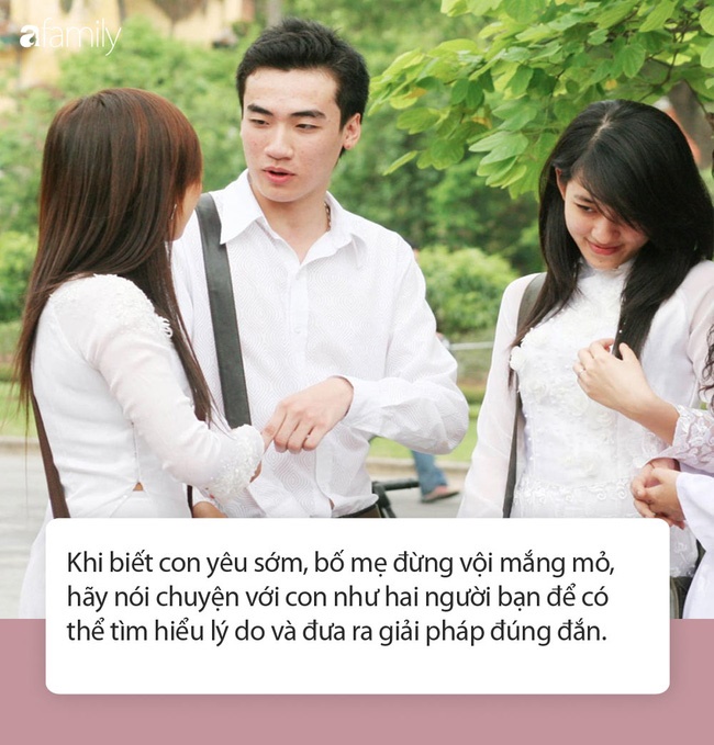 Cha mẹ nên nói chuyện nhẹ nhàng với con như hai người bạn để tìm hiểu lý do tại sao con yêu sớm. Nếu chỉ là con giận cha mẹ vì cha mẹ mắng và đi tìm người yêu để giải tỏa tâm lý, "trừng phạt" cha mẹ thì phụ huynh nên lắng nghe, giải quyết vấn đề cùng con, dành nhiều thời gian cho con hơn.
