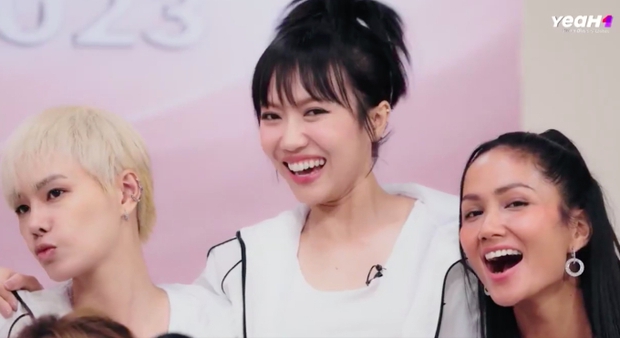 "Chị đẹp" có mái tóc tomboy vàng óng được cho là Hà Kino, nữ nghệ sĩ đứng giữa là Diệu Nhi và ngoài cùng là Hoa hậu H'Hen Niê