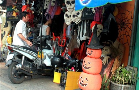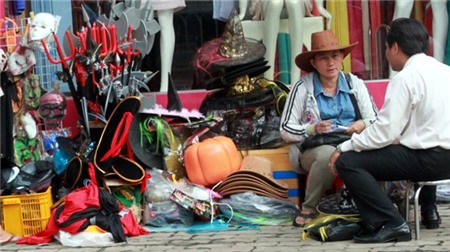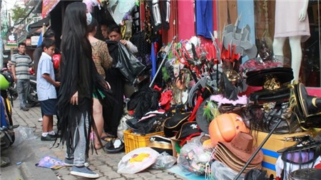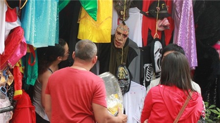 Ngoài các mặt hàng để trang trí như quả bí ngô, mặt nạ, giấy dán hình rơi, quạ…còn có các sản phẩm kinh dị quần áo hóa trang vấy máu, đầu lâu, chân tay người bị chặt đứt lìa...