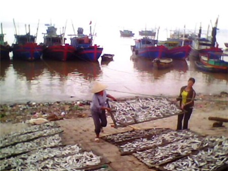 Người dân huyện Tĩnh Gia đang phơi cá với hóa chất diệt côn trùng.