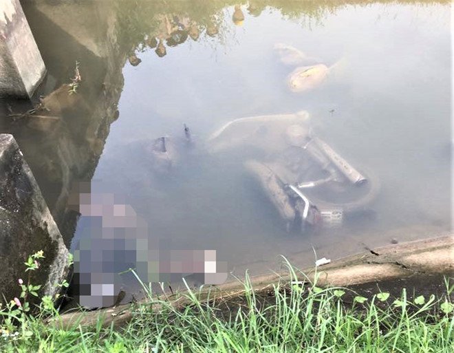 Thi thể 2 nam thanh niên cùng chiếc xe máy được người dân phát hiện. Ảnh: Phạm Tuấn.