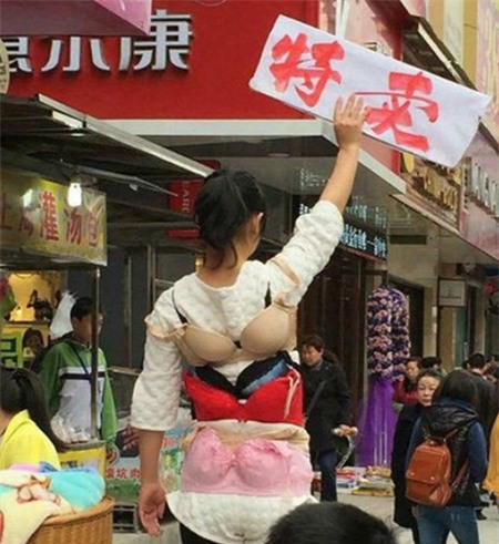 Cô gái này rao bán nội y, và đó là lý do để cô khoác nguyên 5, 7 chiếc áo ngực lên người. |