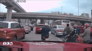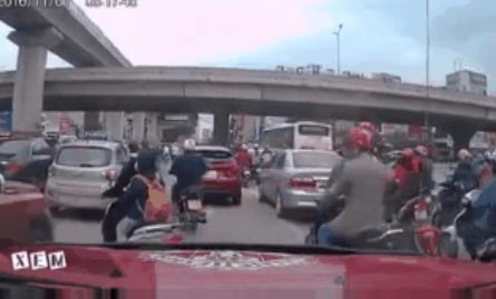 Video được một ô tô có gắn camera hành trình ghi lại vào hồi 8 giờ ngày 1/11 tại nút giao Khuất Duy Tiến – Nguyễn Trãi (Hà Nội). Ngay sau khi có xảy ra với chiếc ô tô mà người phụ nữ tạt đầu, chiếc xe máy đã bị nghiêng và đứa con ngồi trên xe bị văng ra khỏi yên xe.